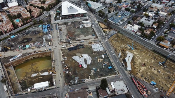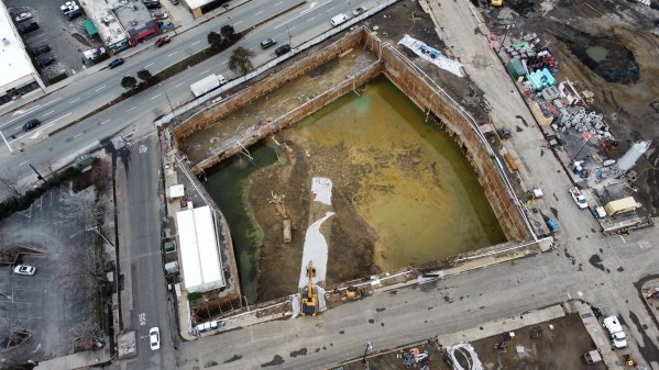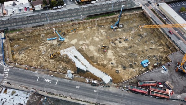 Note the ramp, covered with a white tarp or some such, that allows construction vehicles to enter and exit the pit. To orient you here, Main Street runs along the bottom of the image, the Caltrain tracks run along the top, and a portion of Chestnut Street is visible cutting diagonally along the image’s upper right corner.