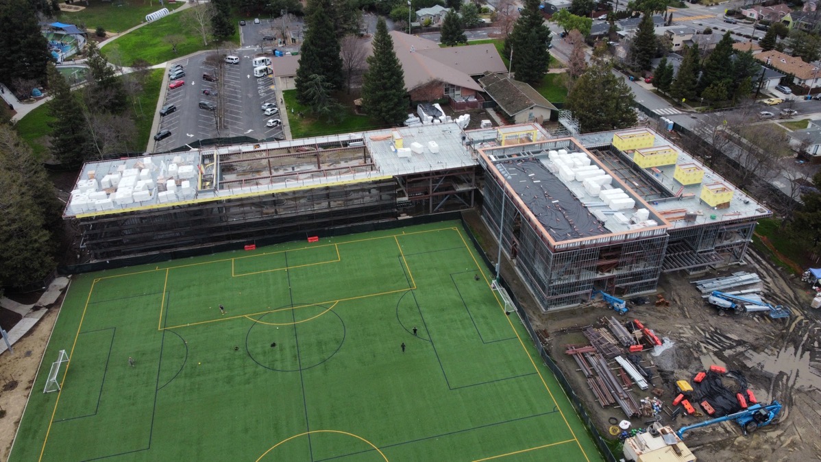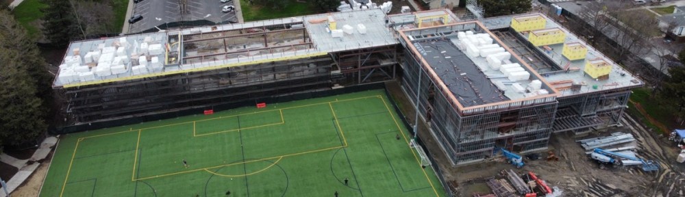 This aerial viewpoint also shows off one of the building’s most interesting features: the large opening in the roof of the left-hand portion of the building. That hole exposes a large portion of the building’s second floor to the sky; below that hole, on the second floor, there will a running/walking track. Below that track, on the first floor, will be large rooms dedicated to wellness and “adaptive PE.” And to the left of the hole, that entire end of the building will be a two-story-high gymnasium.
