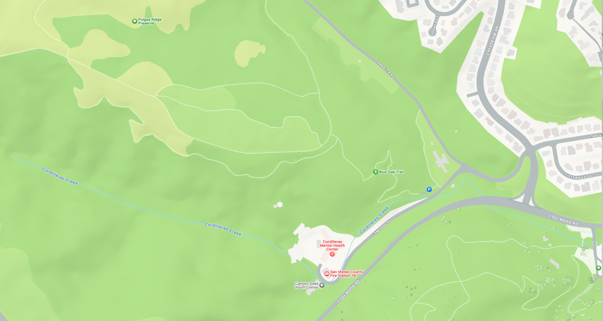 If you look closely at the map I shared earlier, it appears that Cordilleras Creek doesn’t begin on the other side of Edgewood Road (which is the white line that roughly follows the creek in the map’s lower-left quadrant). That map, at least in this respect, is wrong. Here is a different map, showing a closer look at the true origins of Cordilleras Creek (you may want to click on this one to get a version you can zoom in on):
