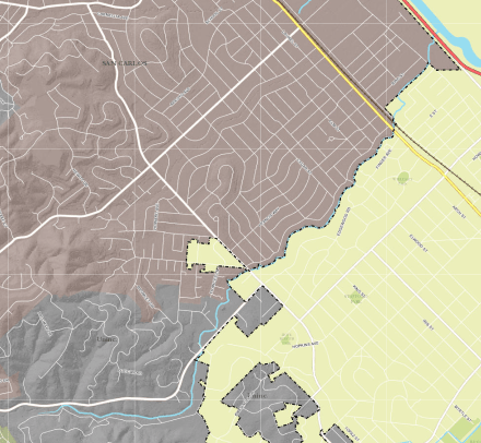If you look closely, you’ll see the creek as a blue line flowing from the lower left corner of the map to the upper right corner. For orientation, that red line marking off the upper right corner is Highway 101, and the water just beyond it separates Bair Island (that bit of yellow in the very corner) from the “mainland.” The portion of the map colored in yellow is Redwood City land, while the portion in brown is San Carlos. The bits in gray are unincorporated parts of San Mateo County. Finally, note the dotted line that lays over much of the creek; that dotted line delineates the boundaries of Redwood City.