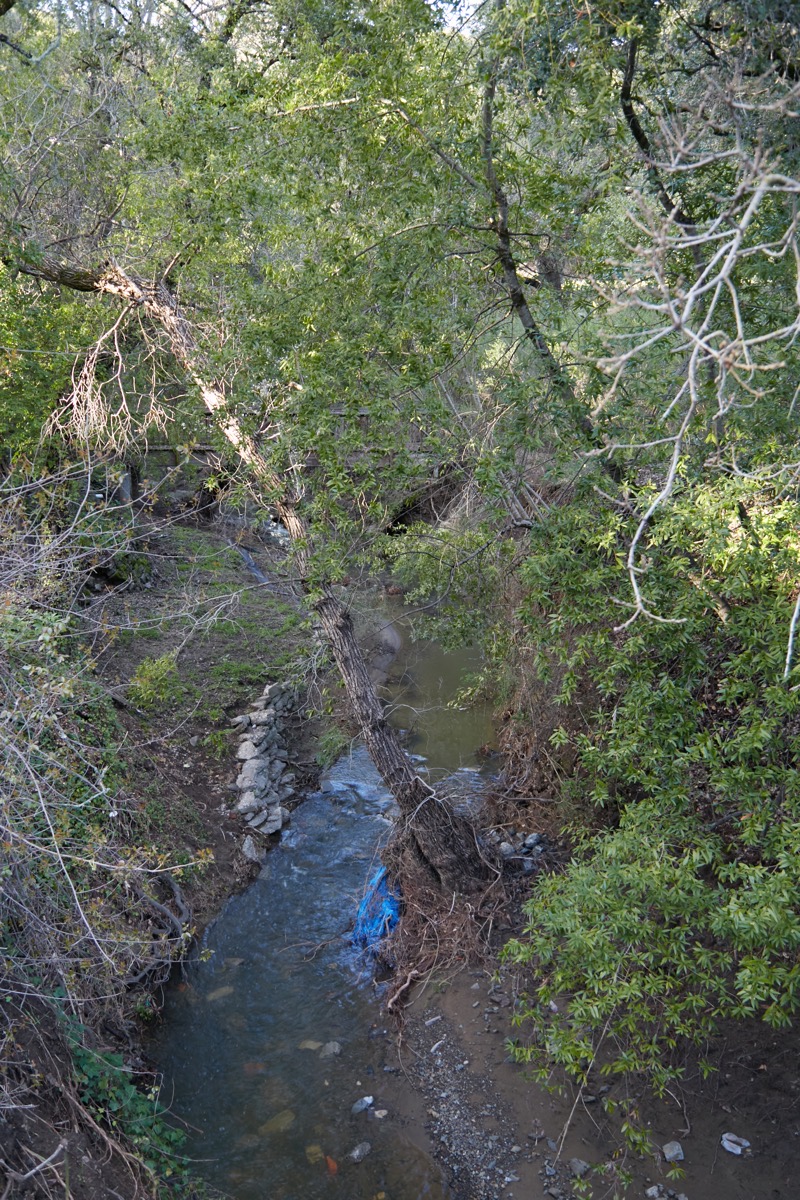 Cordilleras Road, as you may know, starts and ends at Edgewood Road. At its eastern terminus, the creek — which has faithfully followed Cordilleras Road on the northern side for the entire length of the street — ducks beneath Edgewood Road and then heads northwest, very roughly following Edgewood Road out to Alameda de las Pulgas. Where the creek crosses Edgewood itself is a bit hard to see unless you really look for it: the bushes are quite thick. But head east and turn onto Scenic Drive (which is a signal), and you’ll get a nice view of the creek on the west side: