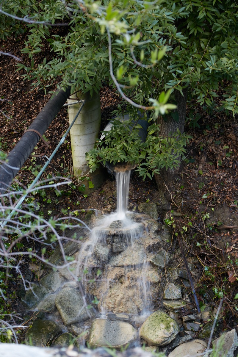 The above is how it looks as it approaches Edgewood Road. The creek ducks under that street, just west of Crestview Drive, and reemerges to then make its way through the entrance area to Edgewood Park. From there, it parallels Edgewood Road on the south side until it reaches Cordilleras Road, where it ducks beneath the street and emerges on the north side of Cordilleras Road. As it goes, you’ll not be surprised to learn, it picks up additional volume, fed in large part by culverts and pipes draining water from the many adjacent private properties: