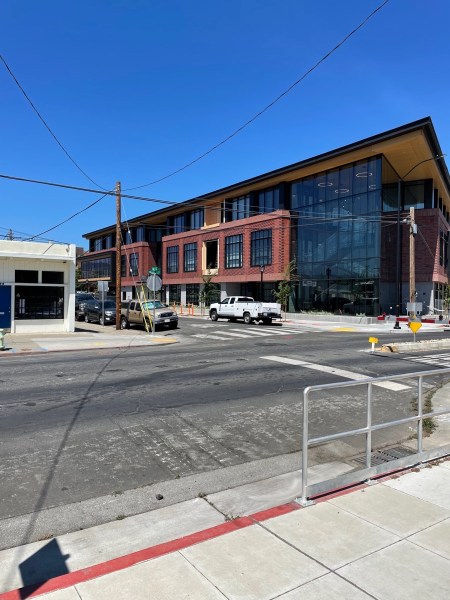 I find it kind of funny that this triangular office building has an address of 1180 Main, even though its most prominent entrance (shown above) faces onto the intersection of Maple and Lathrop streets. The parcel is five-sided (it looks a bit like home plate on a baseball diamond) with the other three sides being the Caltrain tracks, Elm Street, and, yes, Main Street. The building does have a door at the corner of Main and Elm streets, so perhaps that’ll be the actual primary entrance to the building: