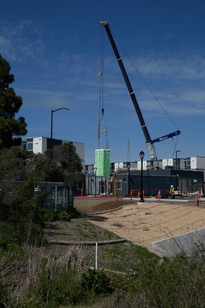 I continue to be fascinated by the county’s Navigation Center project. I watched as the site was raised up and then prepared for construction, watched as the two larger buildings were constructed using conventional techniques, and then excitedly watched as the residential modules, and a handful of support modules, were craned into place. I’ve been waiting for the decking that connects and provides access to the second- and third-story modules was put into place, along with the stairwells, and that wait was finally satisfied this week: pretty much all of those pieces have now been added. What I had forgotten about, though, are the two elevators that provide access to the upper floors of the two three-story “stacks.” In a normal project, those elevators would have been installed early on, with the buildings constructed around them. But not so with this project. Indeed, the elevators seem to have been the two final pieces of the project to be put in place. And in keeping with the way that the rest of this project has gone together, each elevator tower was apparently pre-assembled and simply craned into place: