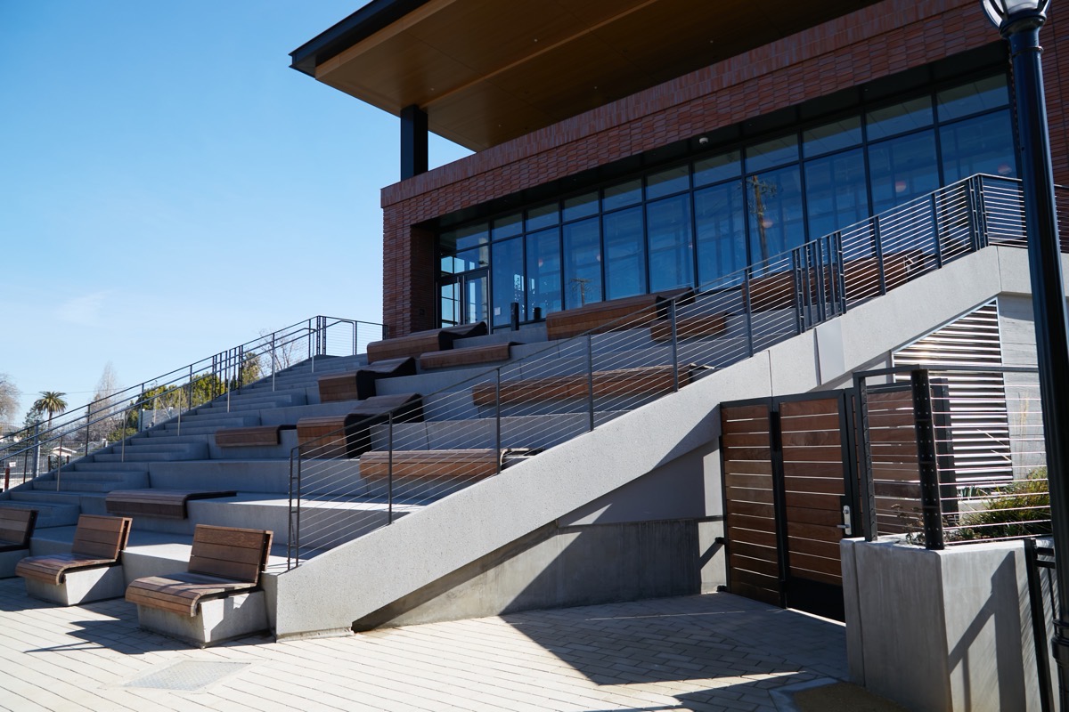 Also be sure to enjoy all of the interesting seating that surrounds this building. In addition to the benches by the coffee hut, there is a neat cluster of benches by the Lathrop Street entrance, and then there are the rather unusual benches on the stairs that form the Maple Street end: