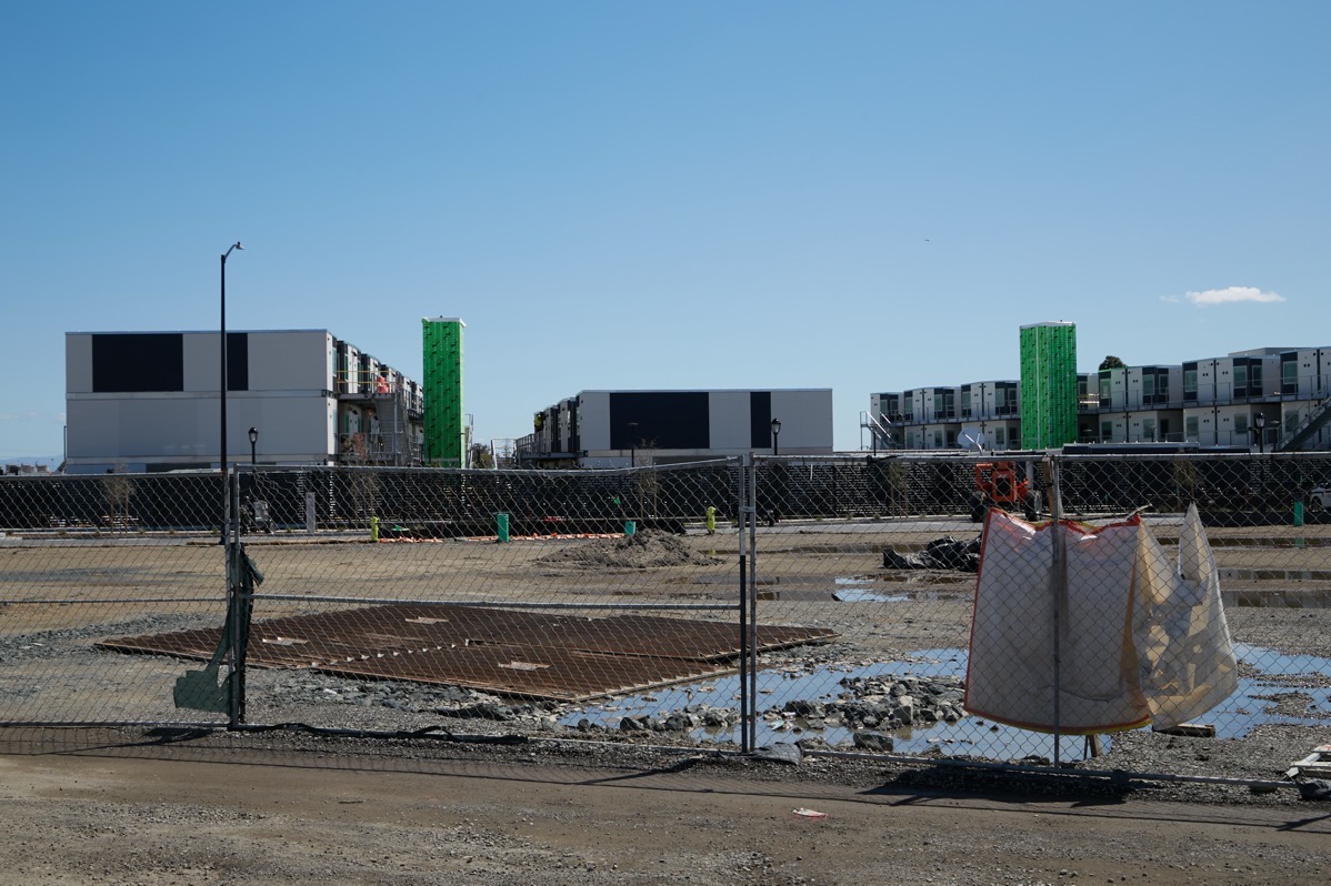 I continue to be fascinated by the county’s Navigation Center project. I watched as the site was raised up and then prepared for construction, watched as the two larger buildings were constructed using conventional techniques, and then excitedly watched as the residential modules, and a handful of support modules, were craned into place. I’ve been waiting for the decking that connects and provides access to the second- and third-story modules was put into place, along with the stairwells, and that wait was finally satisfied this week: pretty much all of those pieces have now been added. What I had forgotten about, though, are the two elevators that provide access to the upper floors of the two three-story “stacks.” In a normal project, those elevators would have been installed early on, with the buildings constructed around them. But not so with this project. Indeed, the elevators seem to have been the two final pieces of the project to be put in place. And in keeping with the way that the rest of this project has gone together, each elevator tower was apparently pre-assembled and simply craned into place: