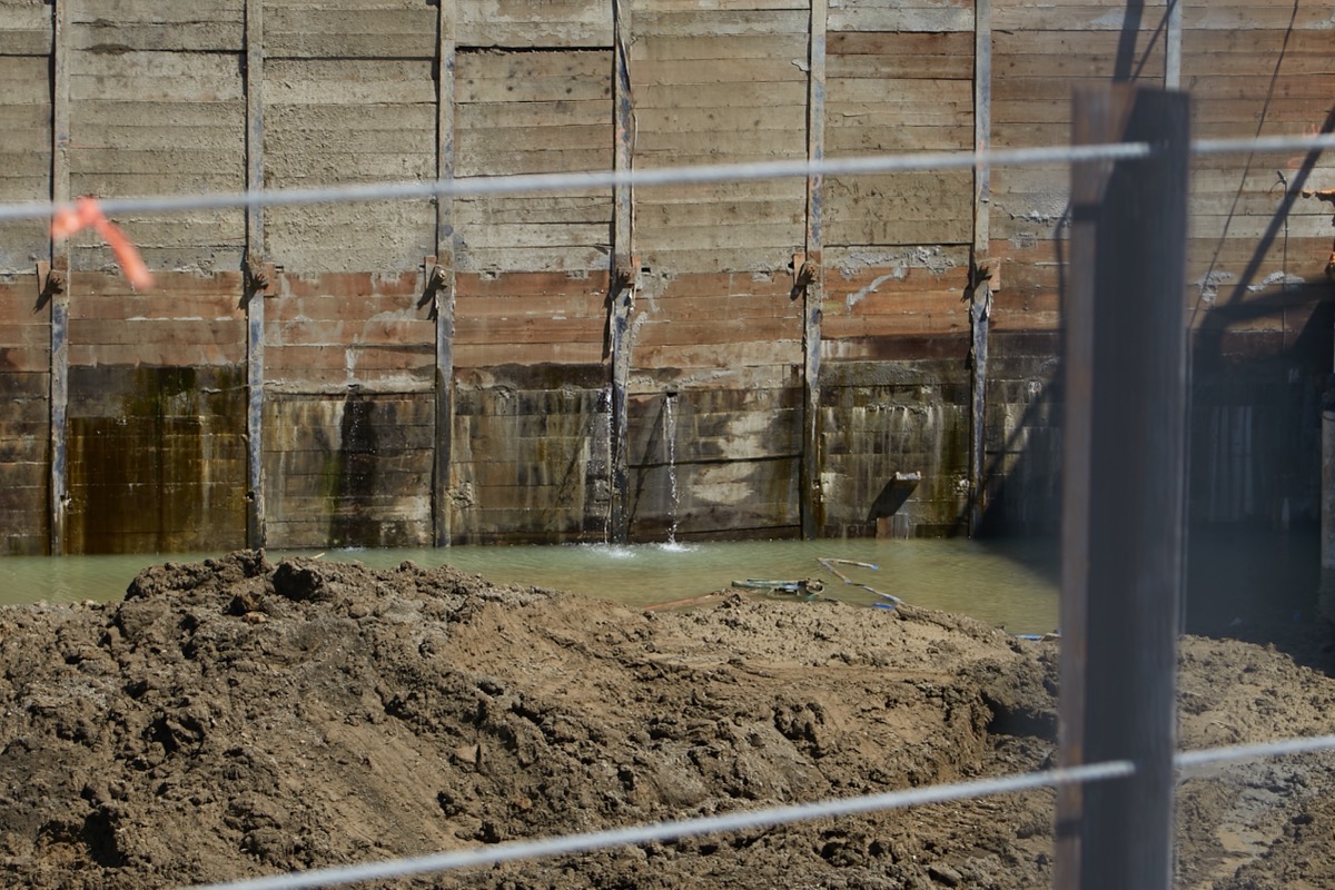 As you might expect, pumps were running to help drain this large excavation, which is by no means intended to be a swimming pool. It, too, sports a large ramp to provide access to equipment such as the backhoe that, while I was watching, was moving the contents of the remaining pile of dirt around: