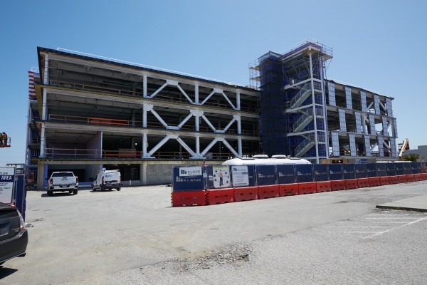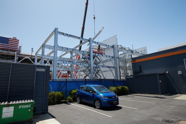 Parking for the building at 777 Industrial Road is interesting. Because of historic ground contamination, the Honda dealership was essentially built on stilts, as a way to minimize disturbance to the underlying soil. This building is preserving that design, leaving the ground floor beneath the three-stories of lab/office space open for surface-level parking. There will also be surface parking adjacent to the building, plus a small 15-space lot out on Industrial Road (777 Industrial is on a “flag lot” that is located behind a single-story dance studio). But all of that still isn’t enough to provide the parking spaces that this new building requires (228 in total), so this building will be accompanied by a small structure holding three large parking stacker mechanisms that together will accommodate 108 cars. Because of its location towards the rear and one side of the property, that small structure is a bit hard to get a glimpse of. For that, I had to go next door, and wander through their parking lot in order to see the steel structure that eventually will hold the stackers: