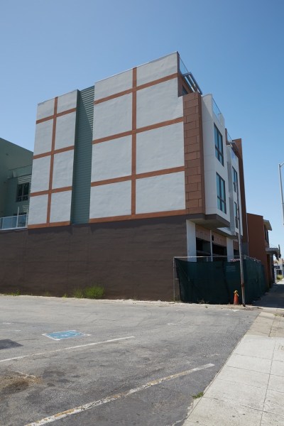 This project is proceeding so slowly that I have to keep checking to make sure that it hasn’t completely stalled, which seems appropriate when you consider how long the Applewood Pizza building sat empty. However, as you can probably tell from the photograph, people were on-site and actively working on the building while I was there, so it continues. When complete, the four-story building at 560 El Camino Real will have 24 condominiums atop two ground-floor retail spaces.