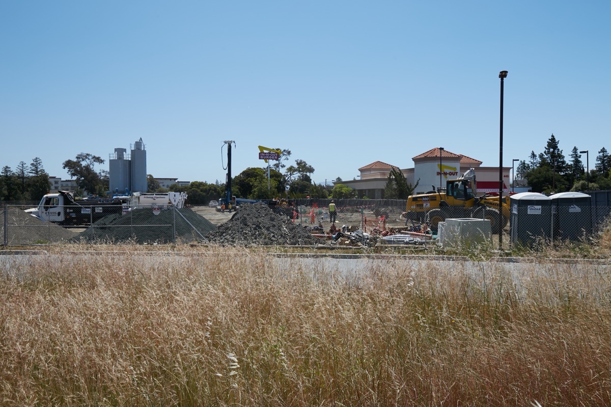 At the moment, however, there is nothing to look at. Just an empty lot, sitting in the crook of the Highway 101 southbound onramp from Holly Street. Just across Holly Street, however, there is San Carlos’ In-n-Out Burger restaurant, and, between that restaurant and the highway, a now empty lot (formerly home to a mini-storage business) where a lot of construction activity has recently gotten underway:
