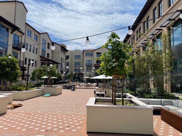Springline consists of approximately 200,000 square feet of office space split across two buildings that front onto El Camino Real; 183 luxury apartments in a third building that faces the intersection of Oak Grove Avenue and Garwood Way (Garwood Way runs right alongside the Caltrain tracks); and a total of about 29,000 square feet of ground-floor retail space spread across all three buildings. Those three buildings sit atop a 942-space, two-level underground parking garage, and surround some lovely plazas (some private, some public).