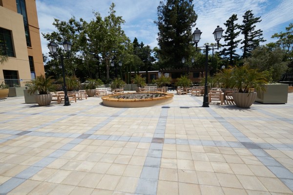 Springline’s large central public plaza, which I entered from El Camino Real between the two office buildings, is quite inviting, with its fountains, planers, and scattered places to sit: