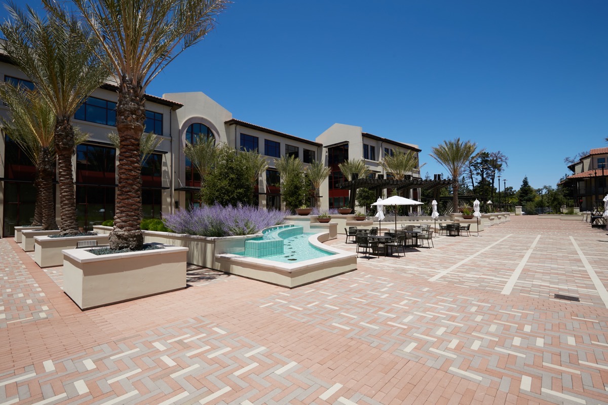 Springline consists of approximately 200,000 square feet of office space split across two buildings that front onto El Camino Real; 183 luxury apartments in a third building that faces the intersection of Oak Grove Avenue and Garwood Way (Garwood Way runs right alongside the Caltrain tracks); and a total of about 29,000 square feet of ground-floor retail space spread across all three buildings. Those three buildings sit atop a 942-space, two-level underground parking garage, and surround some lovely plazas (some private, some public).