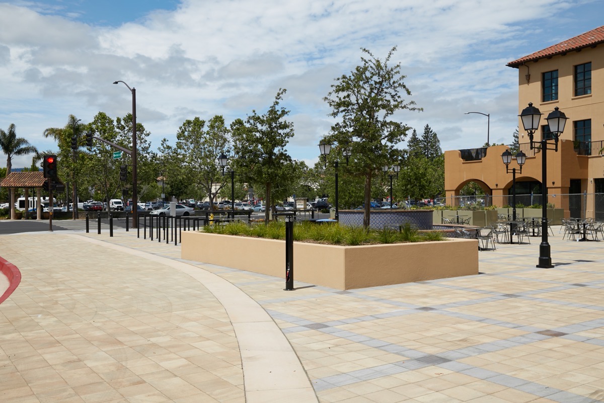 This is a view of the plaza looking away from El Camino Real, towards the Caltrain tracks. And here is what the plaza looks like in the other direction, back towards El Camino Real and the Safeway shopping center across the street: