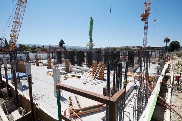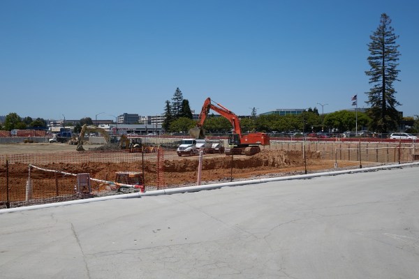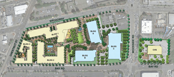 As a reminder, the Broadway Plaza project will ultimately consists of three office buildings (the ones highlighted in blue in the above) and three residential buildings (plus some retail and a childcare center in the residential building along Broadway), with 1.6 acres of open space separating the residences from the offices. (The new CVS Pharmacy across Woodside Road is also part of this project.) The portion of the property now under construction — at the end towards Chestnut Street — is where the residential buildings will be located. In total, those three will contain 520 for-rent apartments, 120 of which will be affordable. The three office buildings will eventually be constructed on the other half of the property, towards Woodside Road. Beneath all of this will be one giant parking garage, with 400 parking spaces dedicated to the residents, 1,035 parking spaces dedicated to the offices, and an additional 274 spaces that will be shared between them. During working hours those shared spaces will be for office use, but after hours and on weekends they will be available for use by the residents living in the three apartment buildings.