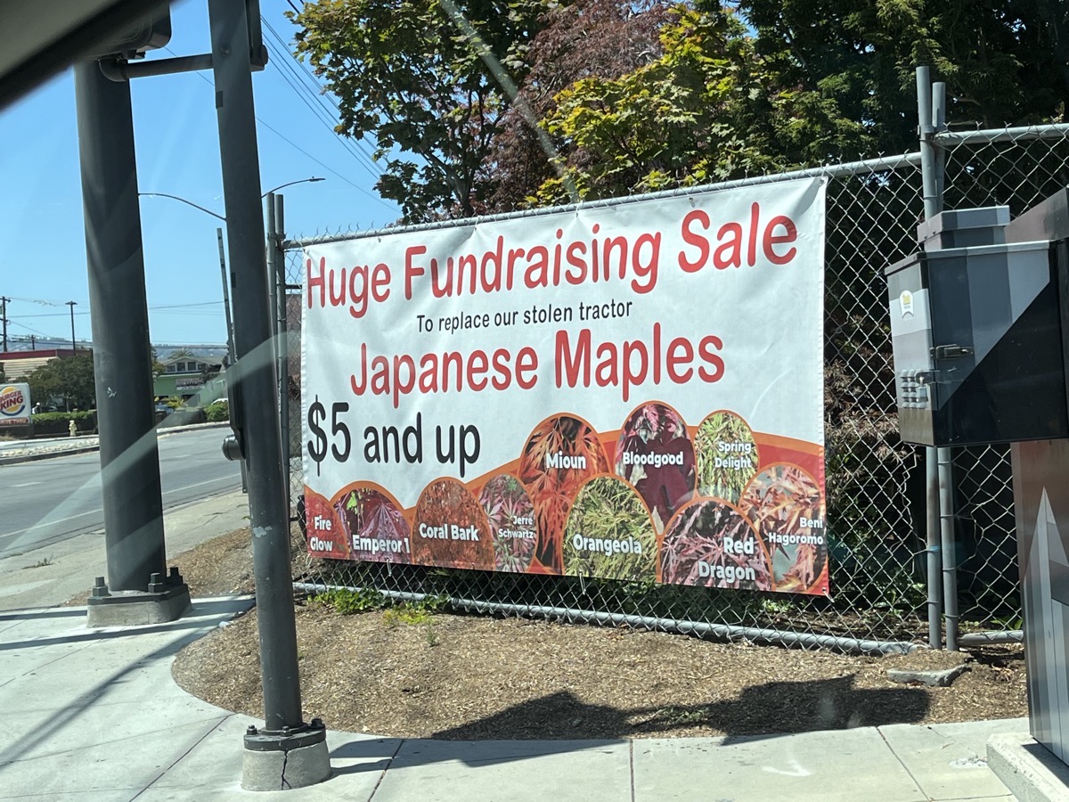 The folks selling Japanese Maples on the corner of Middlefield Road and Willow Street are having a “huge fundraising sale” to raise money to replace their tractor, which apparently was stolen. If you are in the market for some Japanese Maple trees, be a good neighbor and pay this place a visit. They have some really beautiful trees…