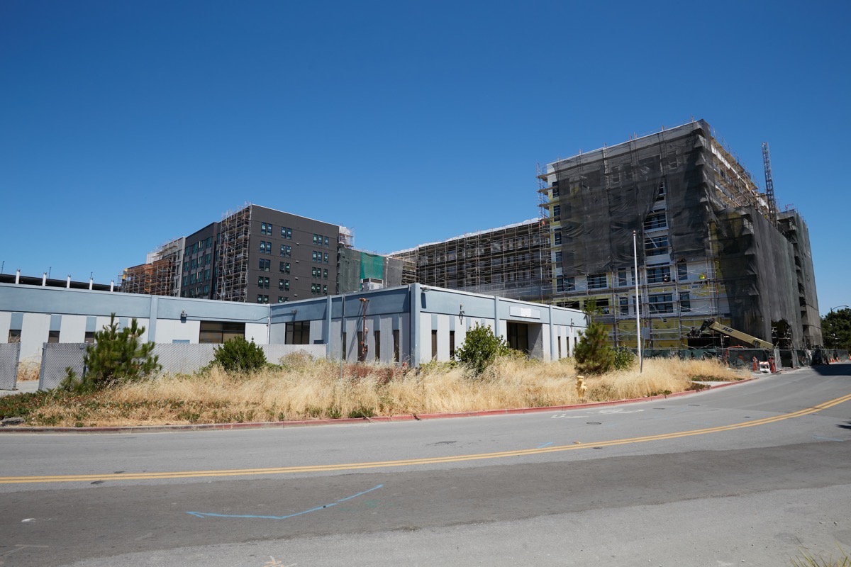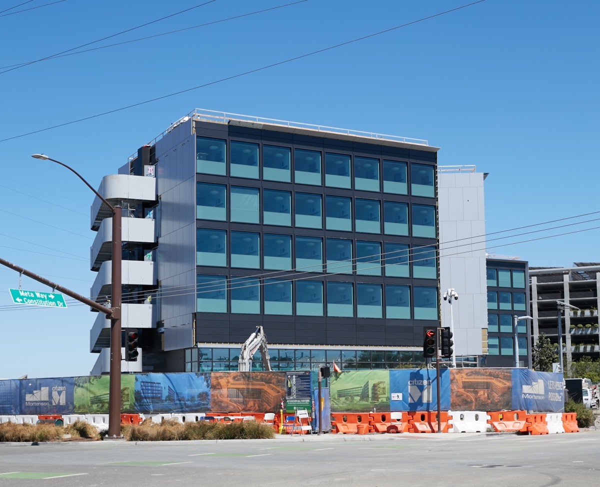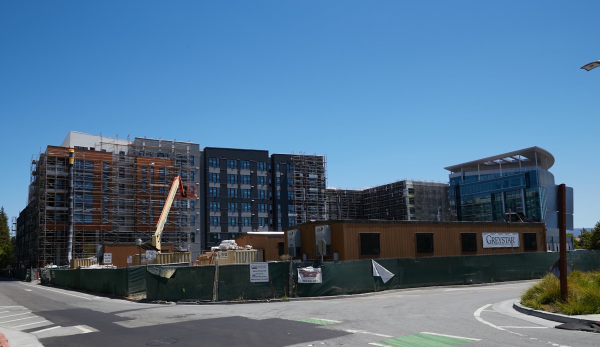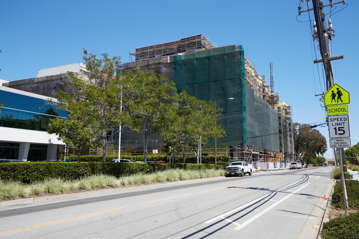 Like with Menlo Portal, this project (“Lume Menlo Park”) spans the width of an entire block. The above image shows the project’s “backside,” at 141 Jefferson Drive. As for the front, it can be found at 172 Constitution Drive. That end is currently covered with scaffolding, though, so here is a view of the side of the project (which is much more interesting, at least for now) as viewed from Constitution Drive: