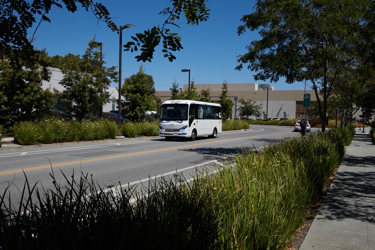 Yep, it’s a parking lot. But not just any parking lot. Many years ago this parcel held a quonset hut out of which some sort of industrial business was being run. But by August of 2014, at least, the property had been cleared and was in the process of being turned into a parking lot. More recently, the parking lot was upgraded with a great many electric vehicle chargers (many of which you can see in the above image); those chargers service a fleet of electric buses, some of which were parked in the lot when I went by. So what is the connection? Those buses run all through the rather extensive Meta campus, ferrying employees from one building to another (and possibly to transit). I don’t know just how many employees are actually working in the offices on any given day, and thus how much ridership this particular fleet is enjoying right now, but as I explored the various Meta buildings later in my walk I did see a couple of those very electric buses making their way from one stop to another: