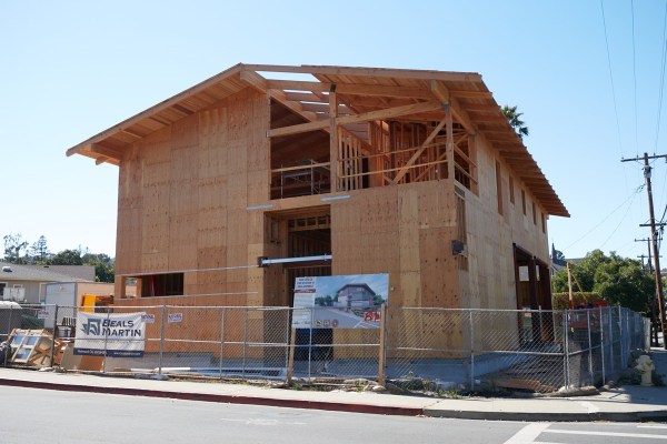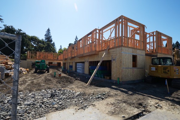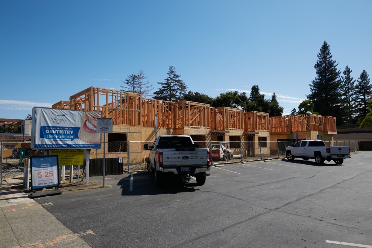 From the park, I then typically wander the residential areas in order to make my way out to Woodside Road; the route I most typically take follows Kentfield Avenue for a portion. Along that street is a project I’ve written about before: the replacement of an old, run-down single-family home at 1460 Kentfield Ave. with a duplex and two ADUs. So far, the contractor has framed up a building along the back of the property that I’m guessing will house the two ADUs: