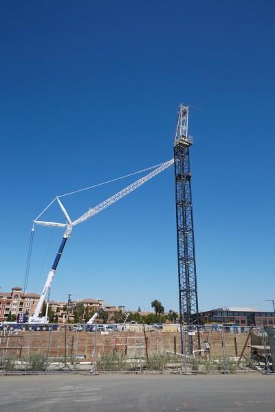 Back out on El Camino Real, the big news on the ELCO Yards project is rather hard to miss, even if you are just driving by: a new tower crane on the parcel that once held Towne Ford’s main showroom: