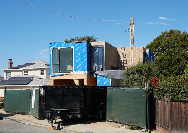 Lastly, I dropped by the modular home at 183 Ruby Ave. (see my post Chasing Houses for some background on this project) to see if they’ve made any visible progress. There has indeed been some: immediately after the house’s six modules were put into place, there were two stacks of three modules each, with a gap between them that I was led to understand will be the home’s main entrance and stairwell. Now, that gap has been filled in, at least on the second story, along with a similar-sized add-on (that faces sideways, rather than towards the street) above the right-hand stack (behind the temporary power pole in the following image):