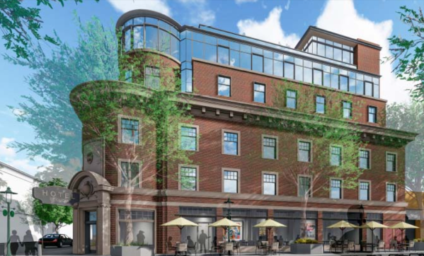 As for the new fourth, fifth and sixth floors, those will echo the look of the lower three, but will be more modern in appearance. They will also be set back eight feet from the lower floors, allowing the historic part of the building to stand proud, and to make clear what is an addition, and what is original. This rendering provides some idea of what the hotel should look like when complete: