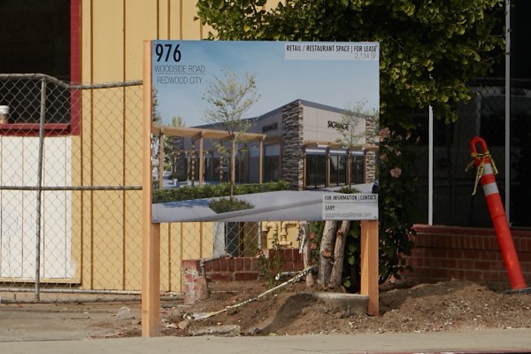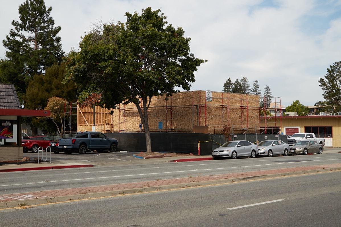 On my drive this week, I first dropped in and checked on the Veterans Memorial Building/Senior Center project. I didn’t see much of note to report — work continues, but from the outside not much has changed for a while now — so I moved on to my next target, the eight-unit townhouse project at 955 Woodside Road, and, directly across the street, the remodeling of the Bravo Taqueria and 5th Quarter Pizza buildings.