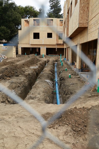 As you can see, the townhouse project is making great progress; the three-story buildings need only receive their roof trusses for framing to be complete. While I was there, I saw a lot of below-ground utility work underway. In particular, those long trenches you see in the above photograph were receiving what appear to be drainage pipes, either for sanitary sewage or for rainfall runoff: