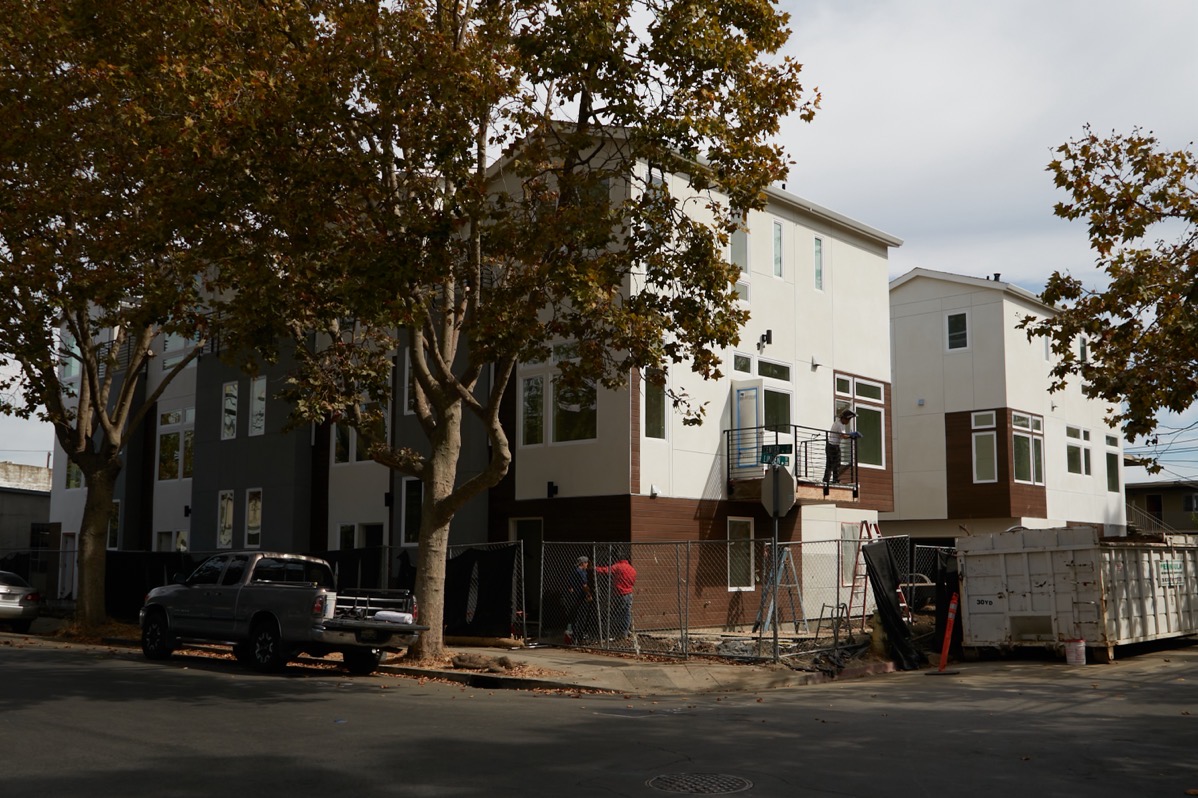 As you can see, the exteriors of the two buildings that make up this development are close to complete. While the interiors likely still have some work to be done on them, this project has been zooming along ever since the first shovel hit the ground. Thus, I expect that the units will be on the market in a matter of a few short months. I for one will be very interested to see what these two and three bedroom units go for: they are right on the edge of a residential area, but on one side they look out onto a motel (the Budget Inn, at 2526 El Camino Real, if you are curious) and on the other they abut a tire repair shop. They have a very transit-friendly location, however, and the other two sides do look out at single-family homes, so there’s that…