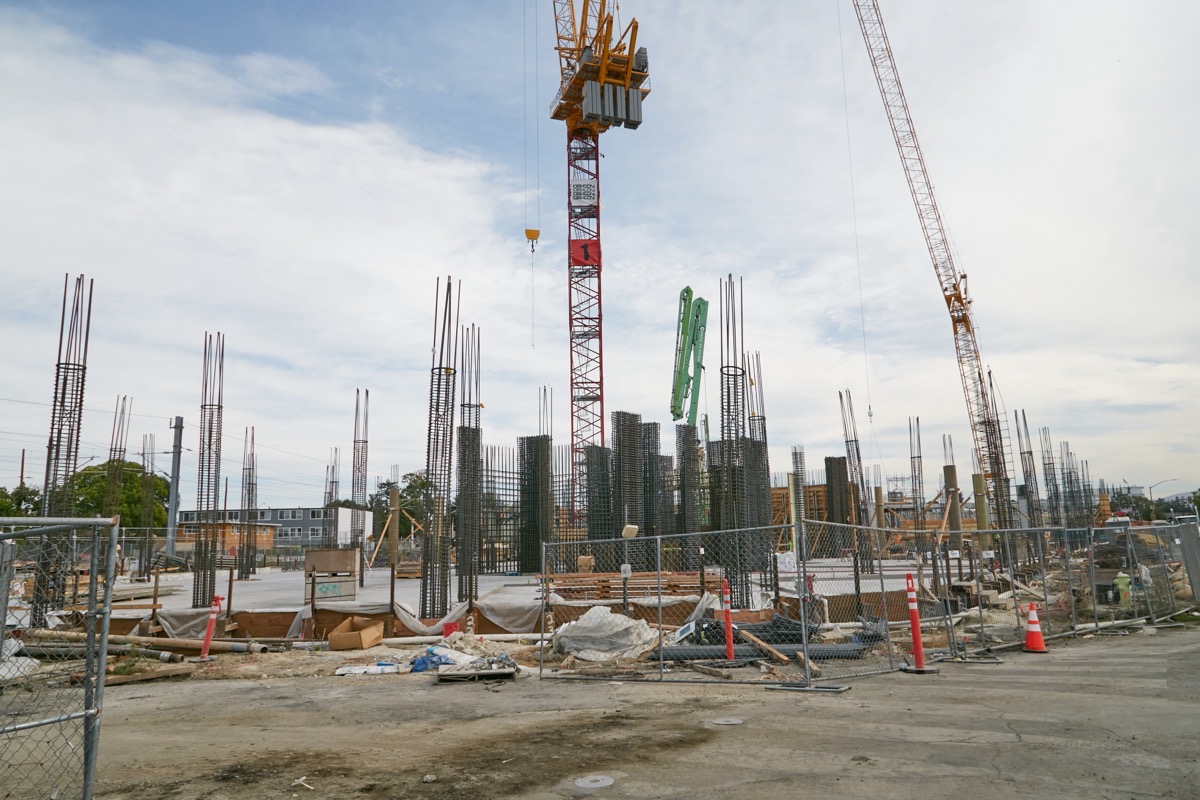 Beneath the concrete floor you see in the above picture is a two-level underground parking garage. The rebar structures you see are will support the two buildings that will sit atop this parcel’s single large garage. I took the above picture from the northwest end, by the Main Street Dog Agility Park; over at the Chestnut Street end of the parcel, the building that will stand there is even farther along: