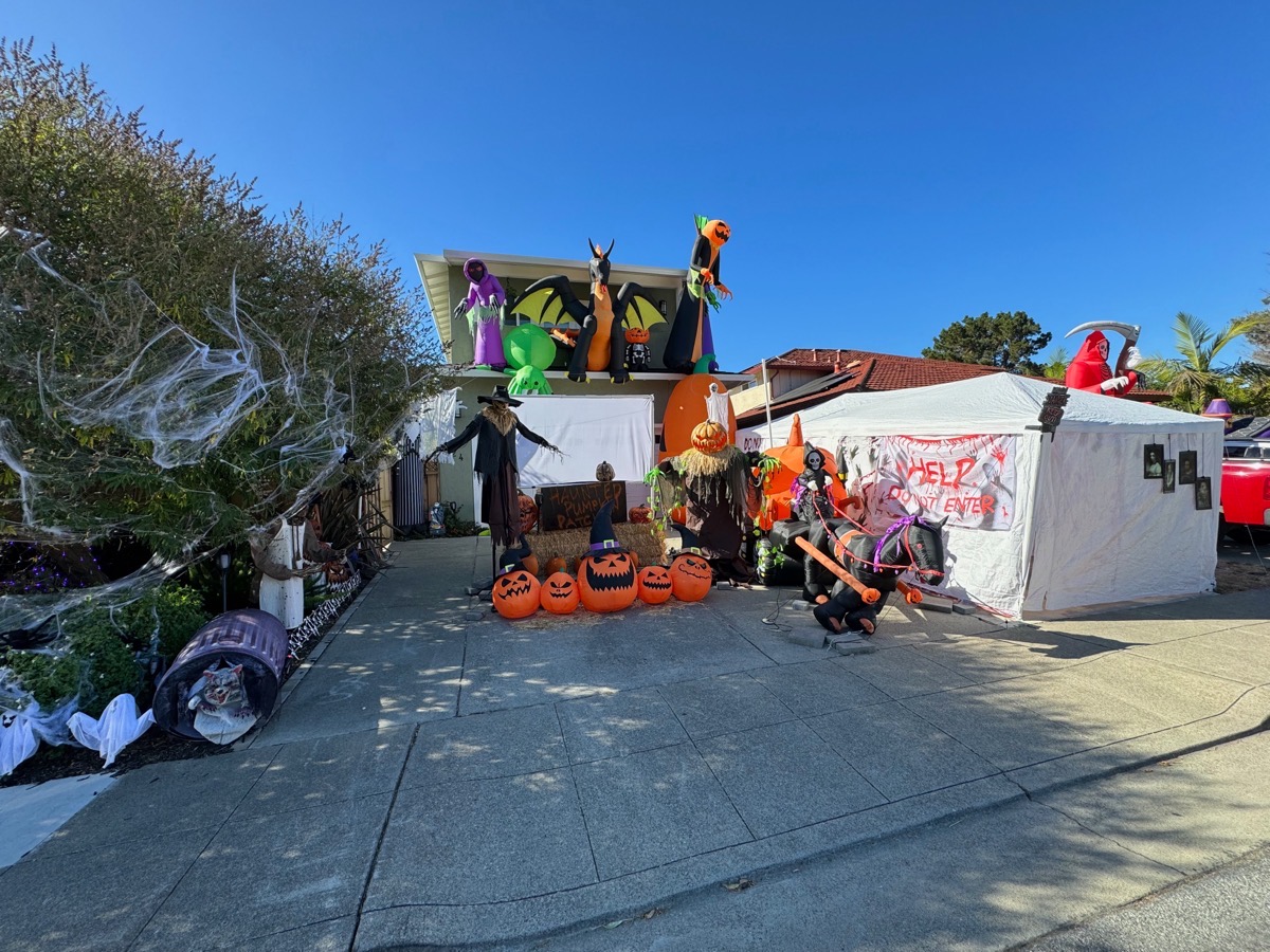 I should note that the above doesn’t show the entirety of the property, and that of course it was taken during the day; it surely looks even more impressive after dark. As do all of the displays, of course. I do want to give a shout-out to the folks at 6 Brigantine Ln. (the other contest entry from Redwood Shores); it isn’t easy to “go overboard” on a Halloween display when you live in a townhouse, but they did a terrific job.
