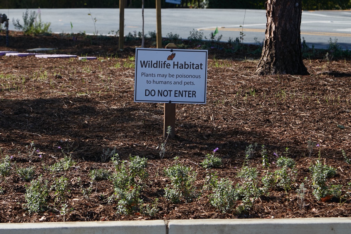 I began, though, by checking out the “parklet” at the corner of Hopkins Avenue and Alameda de las Pulgas, which is now fully landscaped. I like all the trees that the city added, and am interested to see how the plants develop: those have been planted around the perimeter of the parklet, leaving the center essentially un-planted (but covered in mulch). I was particularly intrigued by the signs that the city has installed, marking this parklet as “wildlife habitat”: