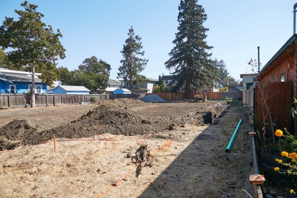 As you can see, this is a particularly deep lot (as in 154 feet deep). The five three-story townhouses will all be located side-by-side in a single building that will sit end on to the street. The front entrances to the three middle units will be close to where that trench you can see in the above photograph is located (the entrance to the two end units will be on the ends of the building), while the five two-car garages will all face the other way, towards that left-hand fence. The project’s main (and only) driveway will run along that fence.