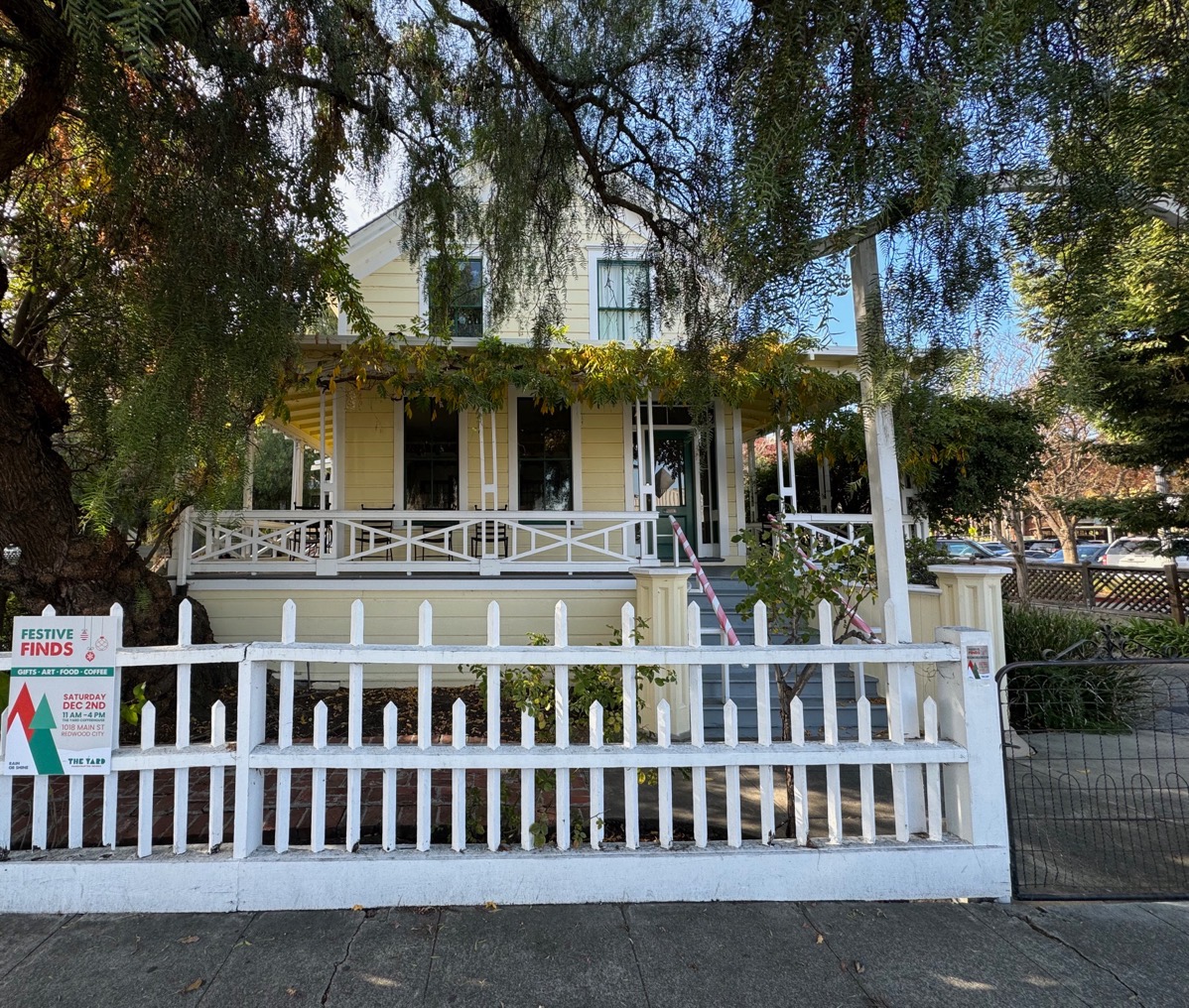 My wife and I were delighted to be able to return to our regular routine, which includes driving for Meals on Wheels every Friday. For the last several weeks we’ve taken advantage of the fact that our drive takes us right down Main Street in downtown Redwood City, where The Baker Next Door has been running a pop-up shop in front of their future storefront at 851 Main Street. They weren’t there today, however, but instead announced that they’ll be selling their bread, muffins, cookies, and other baked goods at a special holiday event being held on Saturday, December 2, at the site of another new forthcoming business: The Yard Coffeehouse. The Yard Coffeehouse will apparently be operating from the beautiful old house situated between the main branch of the Redwood City Public Library and what was Alana’s Cafe. This one: