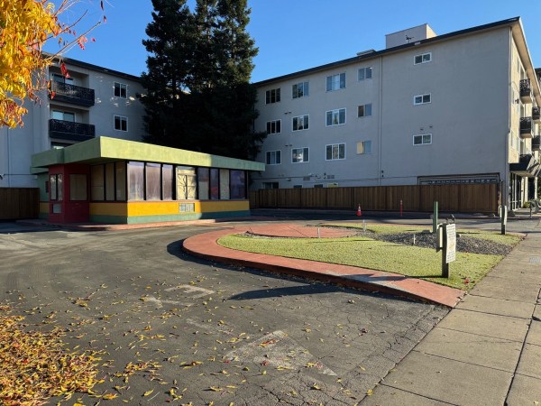 Back to Woodside Road, the renovations on the L-shaped apartment building that extends behind the old drive-thru coffee place is finally done, and the coffee place — which has been closed for a couple of years now, and was being used to stage materials and equipment for the apartment project — seems to have been spruced up: