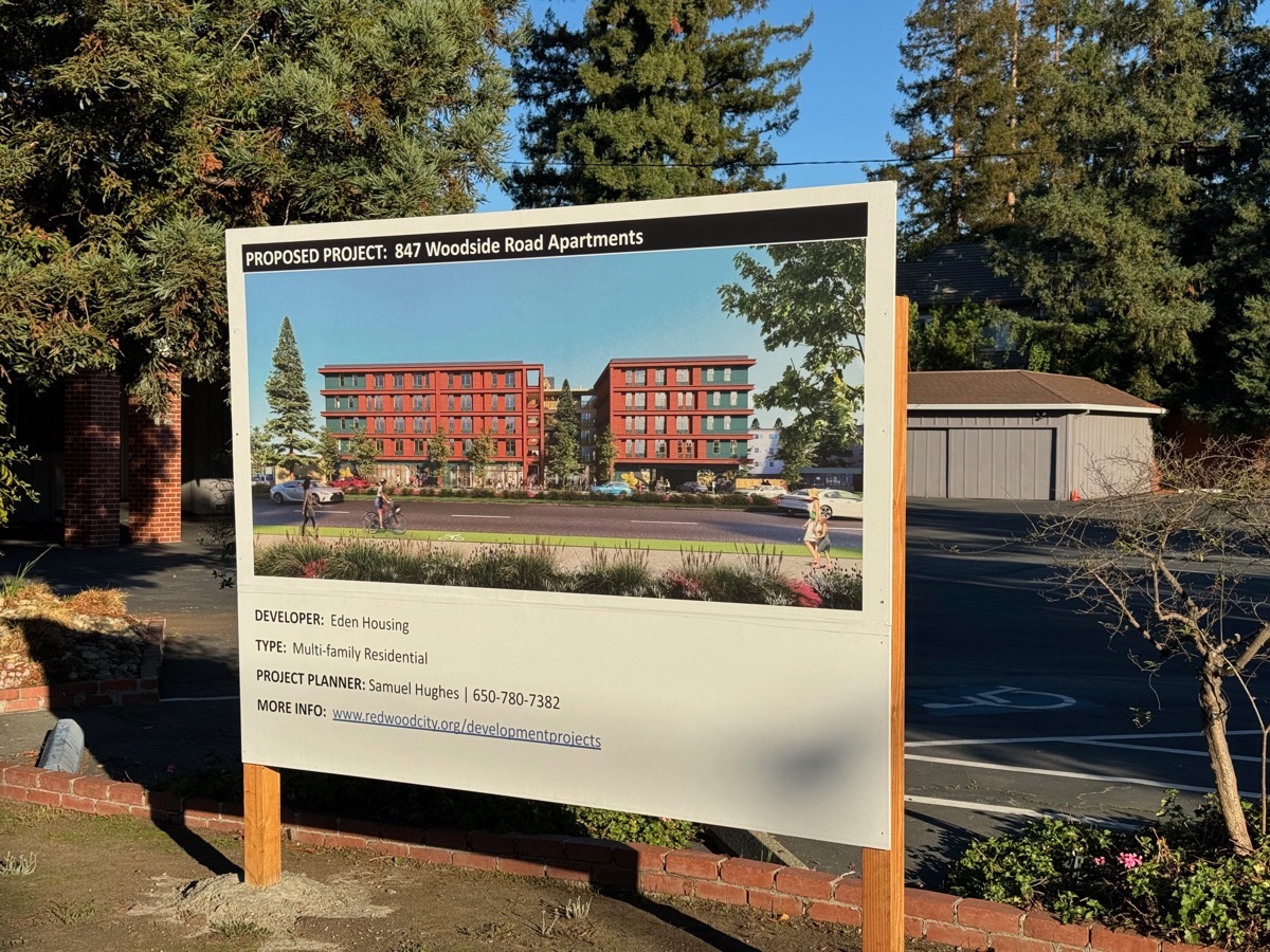 Next door to that coffee place is a building that until recently was a mortuary. These days it is a church of some sort (“Inglesia de Dios Vida”) but as part of the large mixed-use (office and retail) project proposed for 1900 Broadway (in downtown Redwood City; the now-empty building where Wells Fargo Bank once operated), that developer aims to clear this Woodside Road site and then construct a five-story, 86-unit affordable housing project. A sign recently appeared on the site with a nice rendering of what that housing project might look like (the entire project has yet to be approved by the city; it may not be, and even if it is the design of this apartment building may change):