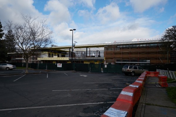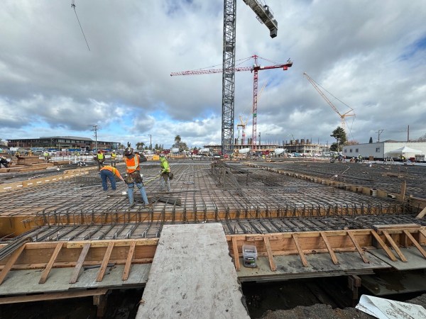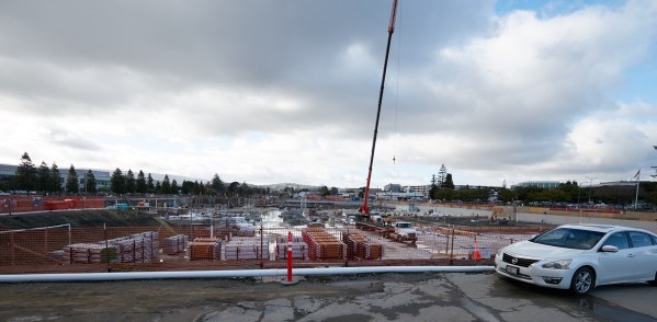 From Red Morton Park, I walked straight down Vera Avenue to El Camino Real, and the site of the massive ELCO Yards project. That project is going like gangbusters at the moment. Along El Camino Real, the large building spanning the block between Beech and Cedar streets is just about to raise above ground level: its three-story subterranean garage is essentially done, with work currently focused on the large concrete slabs that will do dual duty as the ceiling of the uppermost garage level and the base of the building’s ground floor: