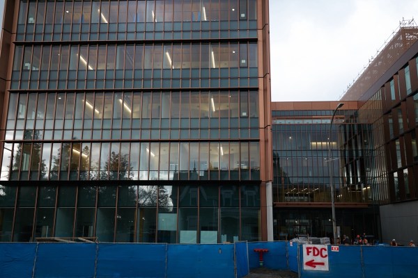You can really see in at night; I happened to be passing by the other evening and could easily see some of the furniture inside (unfortunately, I didn’t have time to stop and take a picture). Although the upper floor offices look finished, parts of the ground floor of the building don’t seem to be; until the building is completely ready, and the ribbon has been cut — something I expect to see happen in the next couple of months — I don’t think anyone will actually move in.