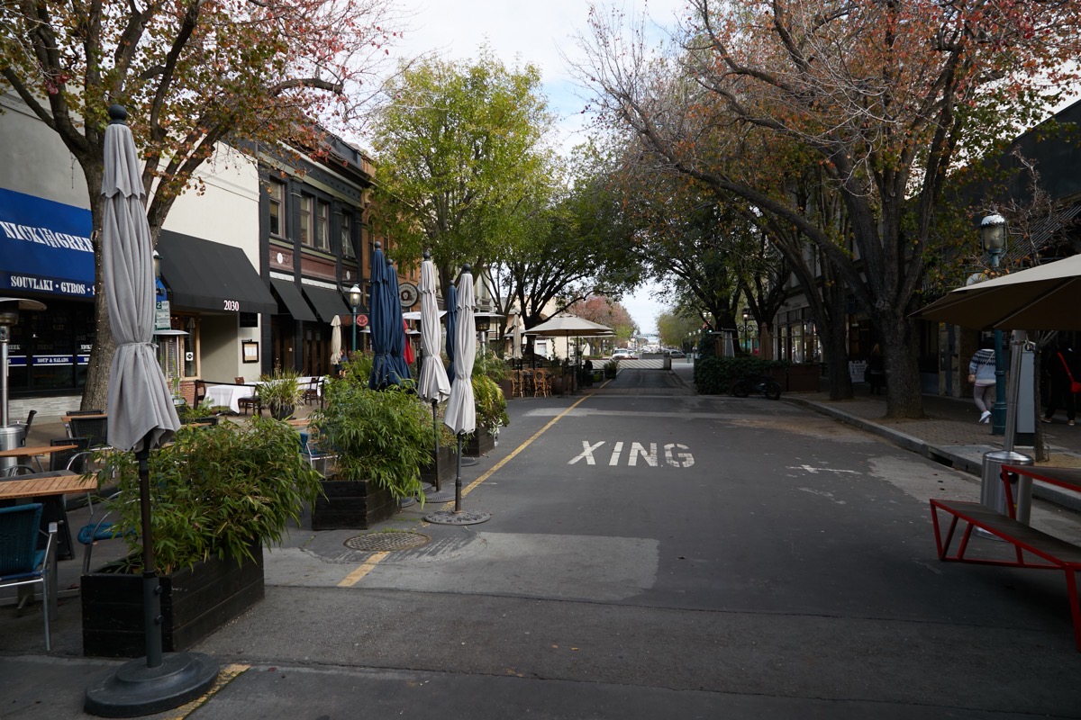 As one who has been advocating for the closure of a portion of Broadway in Redwood City for years now (I first wrote up my thoughts back in March of 2015, in my post A Modest Proposal), I’m pleased to see progress on this — although I find it a tad frustrating at how slowly the wheels of government turn. Assuming that the city does actually make the closure of the 2000 block official, I intend to continue lobbying for the closure of additional blocks. I still maintain that the closure should extend farther to the west, at least as far as Hamilton Street (that is, through the block containing Courthouse Square). After all, the block of Broadway between Jefferson Avenue and Middlefield Road is mostly restaurants, too. At one time, the center of that block was home to the Dragon Theatre, but that theater has been closed for some time now, and is now slated to be remodeled and transformed into yet another restaurant, this one serving Indian cuisine (apparently, a second location for the Brundavan restaurant currently located in Santa Clara). If that happens, essentially all of the north side of the street along that block will be restaurants. And because that section of Broadway remains open to traffic, those restaurants are extremely limited in the amount of outdoor seating they can provide: