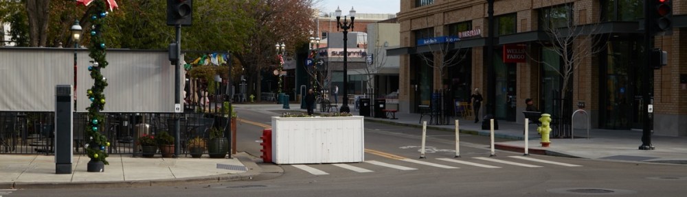 The white planter (plus the orange water-filled barrier behind it) and the temporary plastic posts that block this end of the pedestrian mall would be replaced by a set of pneumatic bollards (metal posts that would sink into the street when access by emergency vehicles is needed). In the closed-off section the street would be reconfigured with a single vehicular access lane down the center of the roadway, leaving most of today’s two traffic lanes available for restaurant seating.