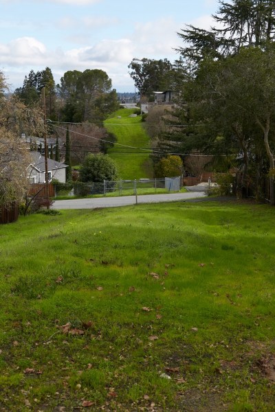 In the foreground, a lovely bit of fenced garden sits right atop the right-of-way (this particular one is just off of Upland Road). Trace the right-of-way with your eyes and you’ll see parked cars: some people have run their driveways over it. At least one church in Redwood City has their parking lot partially on the right-of-way, as does a mortuary out on Woodside Road (Crippen & Flynn). The right-of-way cuts right through the Hawes Elementary School campus: a portion of that school’s playground is built atop the right-of-way. The right-of-way neatly divides Fleishman Park (just southeast of Woodside Road) in two, and then, interestingly, forms the entirety of Linden Park: