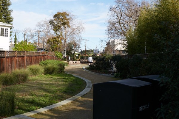 At this point we’re into North Fair Oaks. The path continues straight ahead, cutting through yards and alongside apartment buildings. Two block-long sections are not completely accessible to the public, but are being used to house some lovely community gardens: