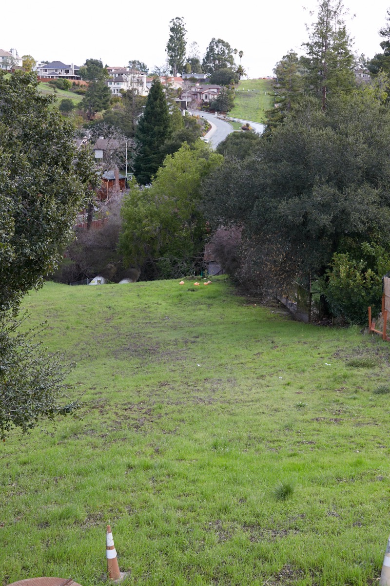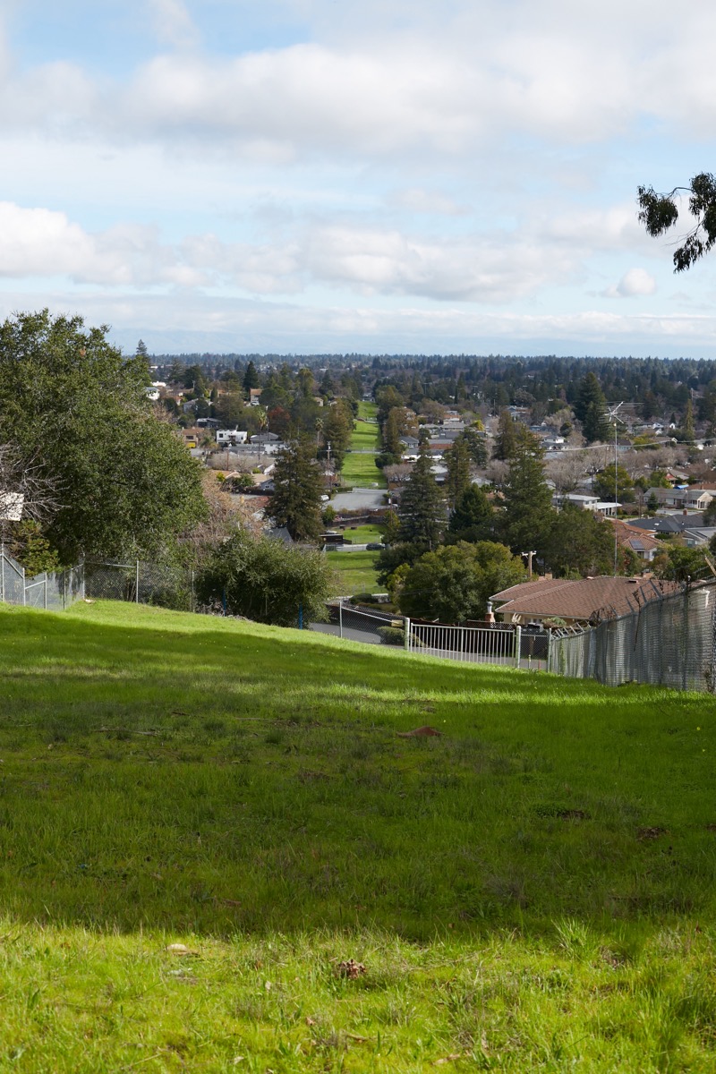The street in the middle of the photo is Oak Knoll. At the top of the far hill you can just make out the end of little Esther Lane, where it dead-ends next to one of Redwood City’s underground water tanks.