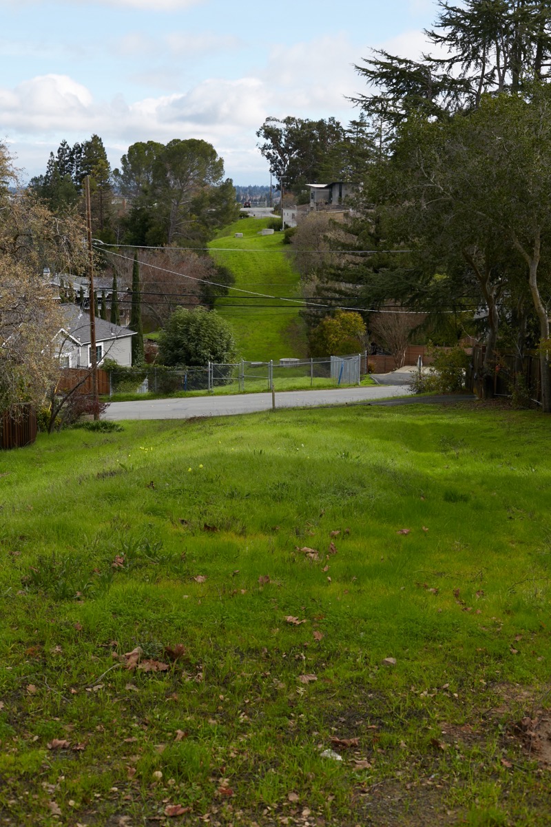 Walking this section involves a lot of up-and-down. I theoretically could have walked up Bennett Road and then climbed the hill, but instead I followed Cordilleras to Canyon Road to Oak Knoll Drive. Coming down Oak Knoll, I then bore left on Hillcrest Drive, which took me up the back side of the hill you see in the above image. Standing on the right-of-way at Hillcrest Drive, a view to the south looks like this: