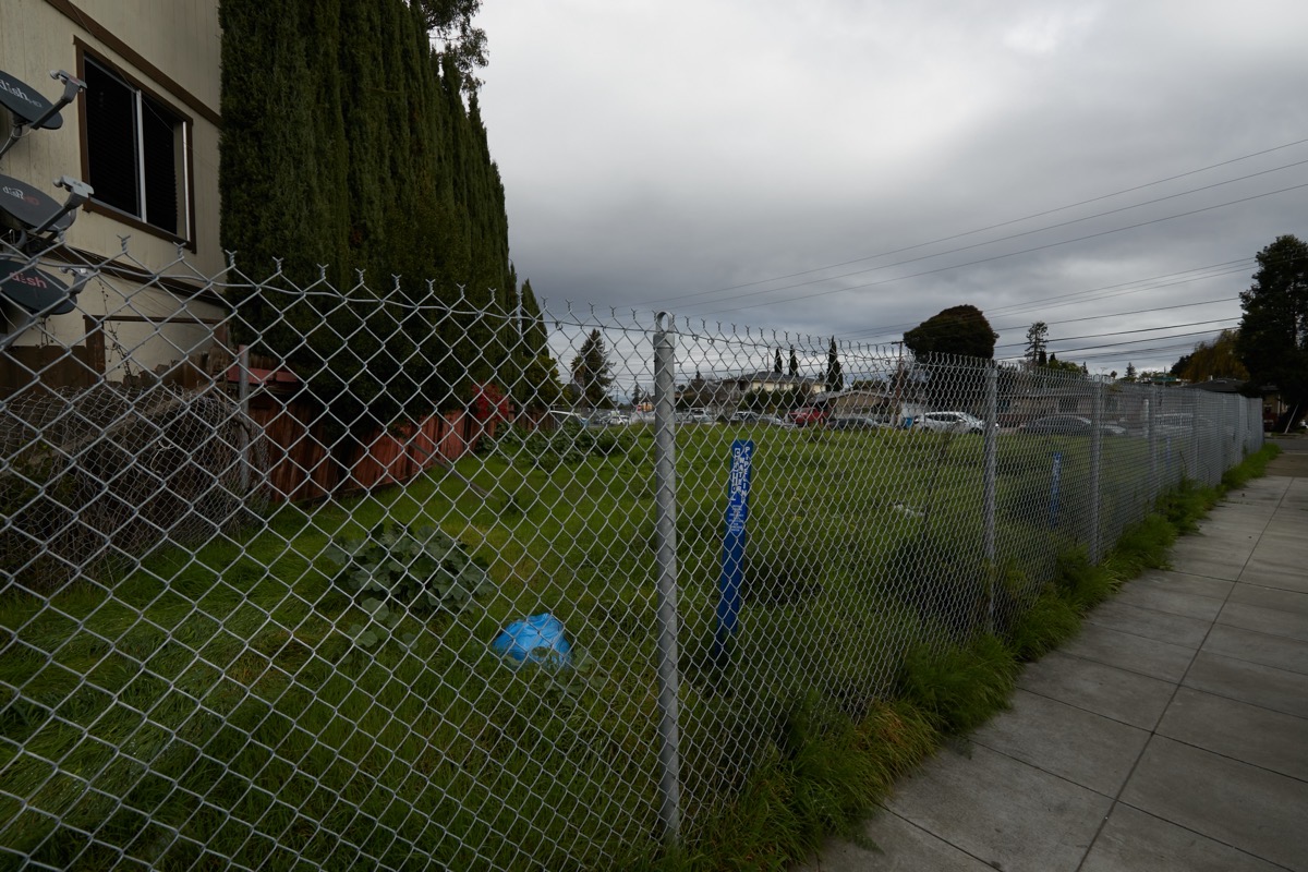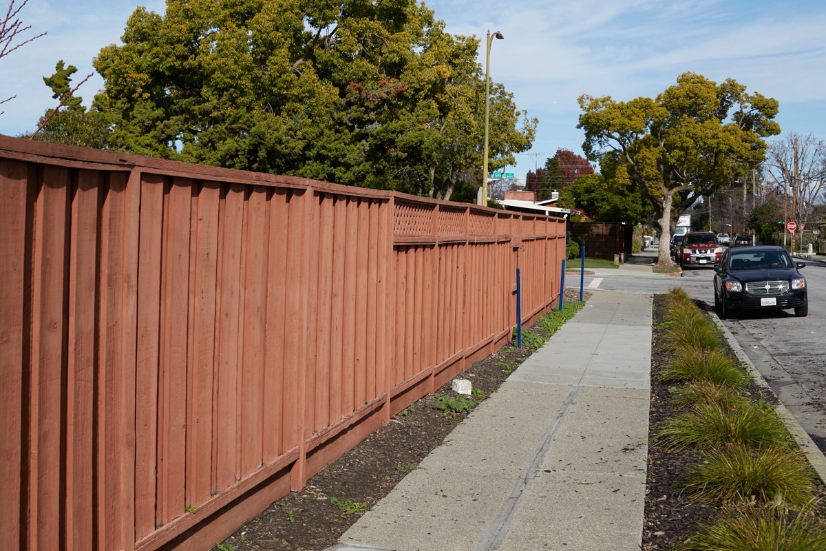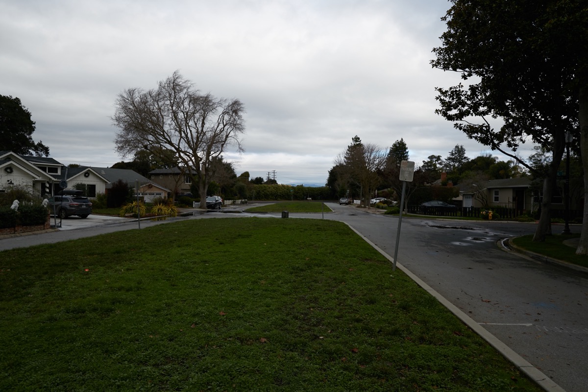 In the foreground, a lovely bit of fenced garden sits right atop the right-of-way (this particular one is just off of Upland Road). Trace the right-of-way with your eyes and you’ll see parked cars: some people have run their driveways over it. At least one church in Redwood City has their parking lot partially on the right-of-way, as does a mortuary out on Woodside Road (Crippen & Flynn). The right-of-way cuts right through the Hawes Elementary School campus: a portion of that school’s playground is built atop the right-of-way. The right-of-way neatly divides Fleishman Park (just southeast of Woodside Road) in two, and then, interestingly, forms the entirety of Linden Park: