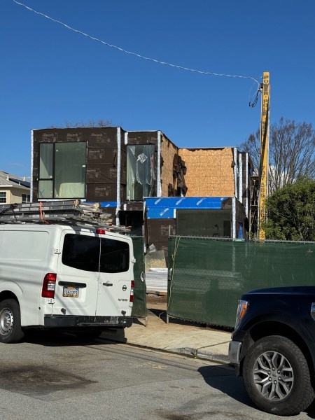 The driveway between the two buildings has been poured, and the sidewalks, walkways, and front stoops were under construction when I was there. From the outside, at least, once the concrete work is done it appears that all that remains is to finish up the small roof overhangs above the unit front doors (they don’t have their shingles yet) and install the landscaping. Presumably some work is still going on inside, but this project looks weeks away from hanging out its “for sale” signs.