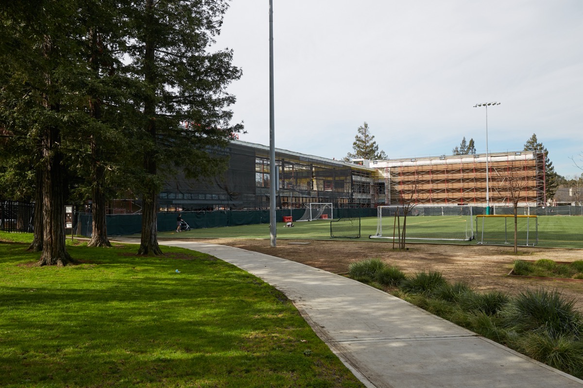 Team owner Eddie DeBartolo’s office was on the ground floor, while head coach Bill Walsh had his office on the second floor. Apparently, Walsh was able to watch the team practice from a second-floor balcony; it looked out over this field (well, an older version of this field) that was used for practices by the team: