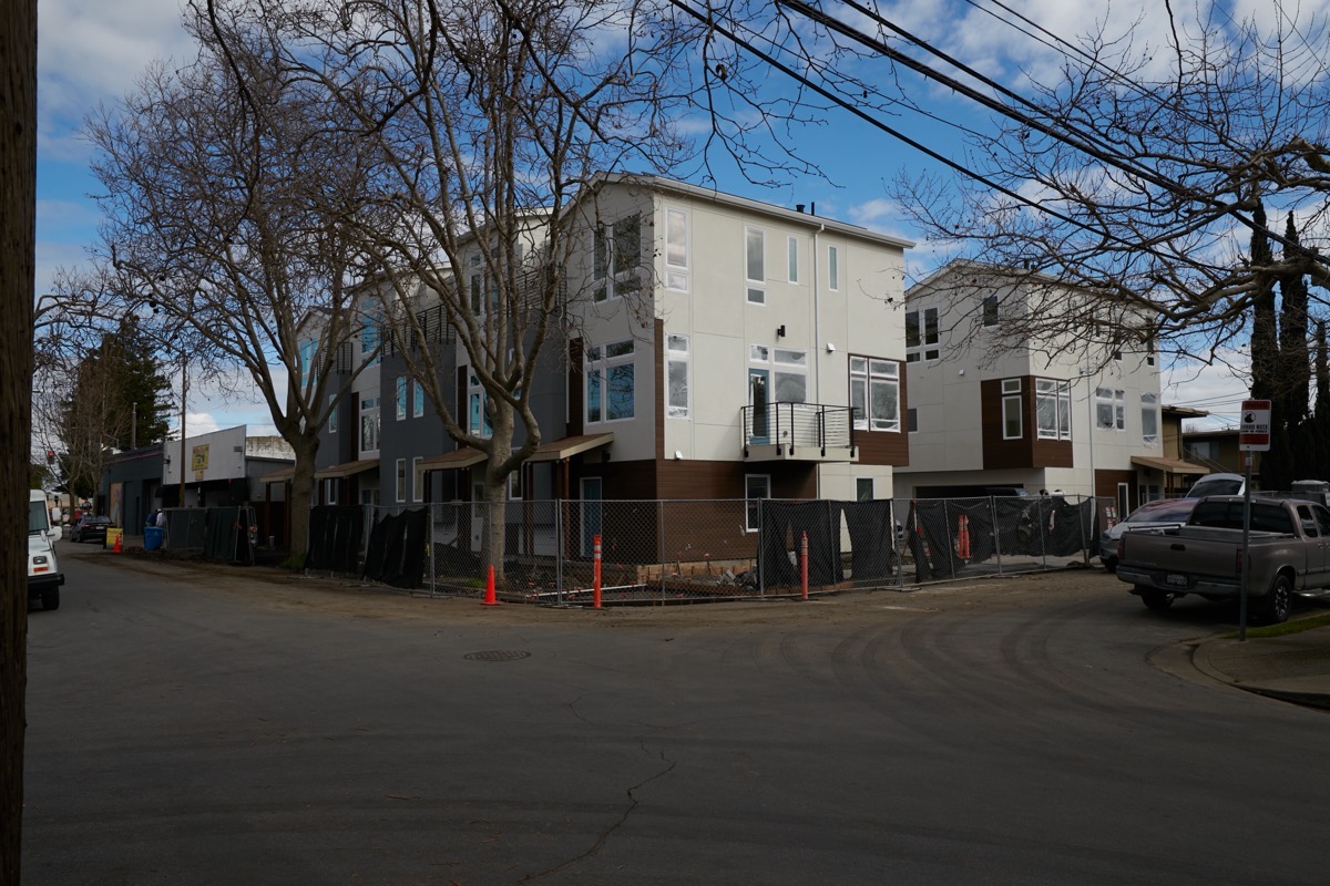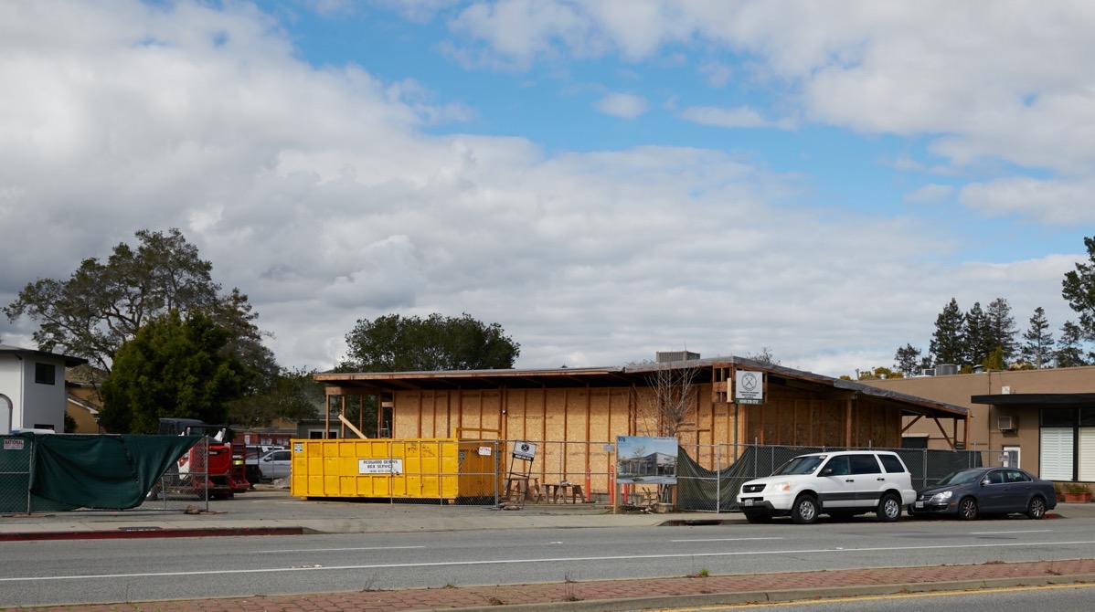Across Woodside Road from the two restaurant buildings, the eight-unit townhouse project being built at 955 Woodside Rd. is moving along at a nice clip:
