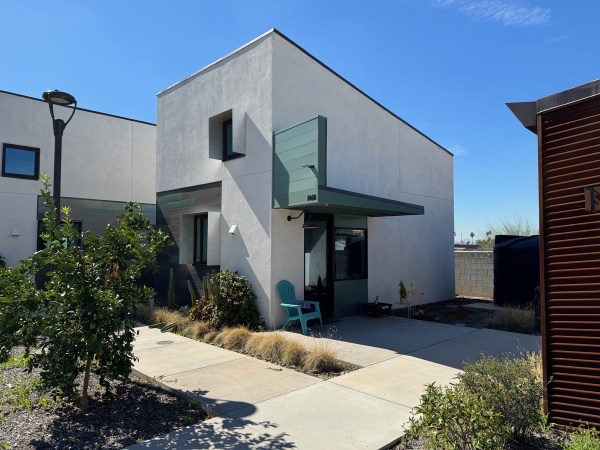 Tempe Micro Estates is a small single-family home development specifically targeted at low- and moderate-income home buyers. The development consists of 13 mostly identical, 600-square-foot units plus a 900-square-foot community center, all arranged around a central courtyard. The one-bedroom, one-bath homes may be modestly sized, but they have full kitchens, sleeping lofts (there is an accessible model that instead sports a “semi-separate bedroom” on the ground floor) and individual patios. These units are designed to be energy efficient, nearly all sporting rooftop solar panels. Instead of individual garages or carports, the development includes a common parking area near the street, roofed over with solar panels and equipped with EV charging stations.