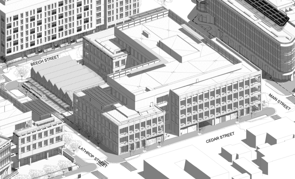 As you can probably tell, from Cedar and Main streets this building should look like a rather conventional four-story office building (with a three-story section at Lathrop and Cedar streets, atop which there will be a small terrace). But carrying on the trend established by the other buildings, this one will have a uniquely styled single-story section at the corner of Lathrop and Beech streets, one sporting a sawtooth roof with skylights. That portion of the building, at least, is captured in the colored renderings: